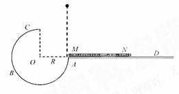 圆弧形光滑轨道ABC,放置在竖直平面内,轨道半径为R,在A 点与水平地面AD相接,地面与圆心O等高,MN是放在水平地面上长为3R、厚度不计的垫子,左端M正好位于A点.将一个质量为m的小球从A处正上方某处由静止释放,不考虑空气阻力,若小球能从C点射出并打到垫子上,小球距离A点的高度在什么范围.