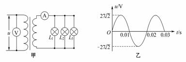 12. (2010德州一模)如图甲所示,理想变压器原、副线圈的匝数比为3∶1,L1、L2、L3为三只规格均为“9V 6W”的相同灯泡,各电表均为理想交流电表,输入端接入如图乙所示的交变电压,则以下说法中不正确的是: