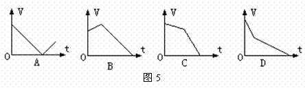 6、物体以初速度V0先从斜面上滑下,接着又在粗糙的水平面上运动直到停止,设物体与接触面间的动摩擦因数为常量,反映这个物体运动情况的速率-时间图象可能是图5中的: