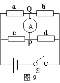有a、b、c、d四只电阻,其中三只电阻的阻值一样,只有一个电阻的阻值偏大。要找出这只电阻,某同学设计了如图9所示电路,当开关闭合时测出有电流从P流向Q,下列说法正确的是: