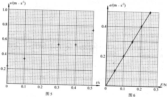 时,打点计时器恰好打B点。请你将①中所得结果标在图5所示的坐标系中,并作出小车运动的