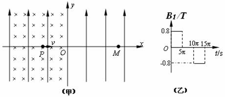 26(22分).如图(甲)所示,在xoy平面内有足够大的匀强电场,电场方向竖直向上,电场强度E=40N/C.在y轴左侧平面内有足够大的瞬时磁场,磁感应强度B1随时间t变化规律如图(乙)所示,15π s后磁场消失,选定磁场垂直向里为正方向.在y轴右侧平面内还有方向垂直纸面向外的恒定的匀强磁场,分布在一个半径为r=0.3m的圆形区域(图中未画出),且圆的左侧与y轴相切,磁感应强度B2=0.8T.t=0时刻,一质量m=8×10-4kg、电荷量q=2×10-4C的微粒从x轴上xP=-0.8m处的P点以速度v=0.12m/s向x轴正方向入射.(计算结果保留二位有效数字)