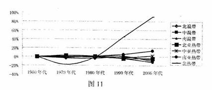(2)描述热带面积1960年代以米的数量变化特点,分析推测1970年以来热带的空间分布变化趋势。(9分)