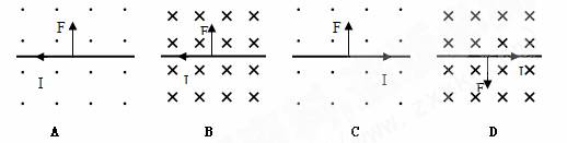 3、如图所示,电流强度为I的一段通电直导线处于匀强磁场中,受到的安培力为F,图中正确标出I和F方向的是