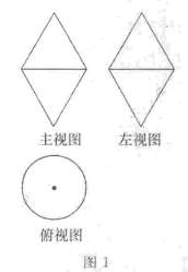 如图1,一个空间几何体的主视图、左视图都是边长为1且一个内角为60°的菱形,俯视图是圆,那么这个几何体的表面积为 ( )