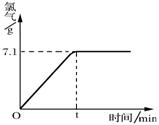 现取一定质量的溶质质量分数为10%的氯化钠溶液进行电解,当氯化钠完全反应时,停止通电。生成氯气的质量与时间的关系如右图所示。