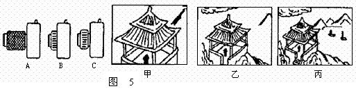 10、假期到了,公园里游人如织,其中三位游客在同一地点,分别用不同型号的A、B、C相机,对着同一个亭子各拍的照片如图5甲、乙、丙所示。拍照时景物到照相机的距离___(填:“大于”、“小于”或“等于”)照相机二倍焦距;图中照相机的暗箱长度相当于___(填:“焦距”、“像距”或“物距”);照片___是用A拍摄的。