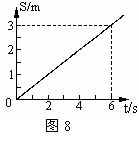 重为120N的物体在80N的水平拉力作用下向右作匀速直线运动,如图7。物体运动距离(s)-时间(t)图象如图8所示。物体受到的摩擦力是_________N,运动的速度是________m/s;如果物体运动了6s,重力做的功是_______J。