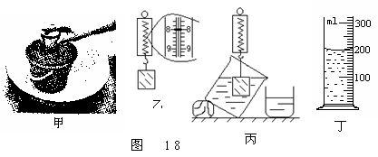 ⑶ 在“探究浮力大小跟排开液体重力大小的关系”时,老师提供的器材如图18乙、丙,小胖先利用弹簧测力计测出物体重力如图18乙所示,G=_______N,物体浸入液体中弹簧测力计示数F=6N,从而计算出物体此时所受到的浮力F浮=________N,为完成实验他还需测量出物体排开水的重力G排,但他发现烧杯无法挂在弹簧测力计上进行测量。经过思考,他向老师要来量筒,并把物体排开的水全部装入量筒中,如图18丁,水的体积为________,从而计算出物体排开水的重力