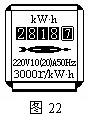 ⑶小胖家里安装的电能表如图22所示,当只有压力锅在正常工作的0.5h内,电能表转盘转过900r,则压力锅消耗的电能是_______ kW·h,请根据上述资料判断该电压力锅是间歇通电工作,还是持续通电工作?答:_______工作。