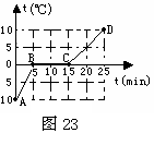 ⑶ 他们还查得:冰的熔化热为3.35×103J/kg,冰的比热容是2.1×103J/(kg·℃),请你根据图23反映的甲烧杯中的物质温度随时间变化的图像回答:第10min时,甲烧杯中的物质所处状态是_________;并计算:甲烧杯中的冰从图23中的B点加热到D点共吸收多少热量?