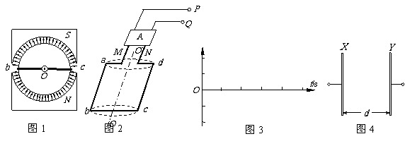 某种小发电机的内部结构截面图如图1所示,永久磁体的内侧为半圆柱面形状,它与共轴的圆柱形铁芯间的缝隙中存在沿半径方向、大小近似均匀的辐向磁场,磁感应强度B = 0.5T。磁极间的缺口很小,可忽略。单匝矩形导线框abcd绕在铁芯上构成转子,如图2所示。ab = cd = 0.4m,bc = 0.2m。铁芯的轴线OO′ 在线框所在平面内,线框可随铁芯绕轴线转动。将线框的两个端点M、N接入图中装置A,在线框转动的过程中,装置A能使端点M始终与P相连,而端点N始终与Q相连。现使转子以ω=200π rad/s的角速度匀速转动。在图1中看,转动方向是顺时针的,设线框经过图1位置时t = 0。(取π = 3)