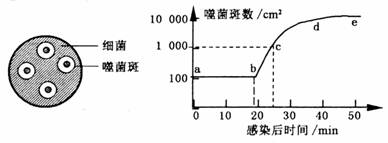 噬菌斑(如下左图)是在长满细菌的培养基上,由一个噬菌体侵染细菌后不断裂解细菌后产生的一个不长细菌的透明小圆区,它是检测噬菌体数量的重要方法之一。现利用连续取样、在培养基中培养的方法测得T4噬菌体在感染大肠杆菌后数量变化曲线(如下右图),下列有关该曲线的叙述中正确的是