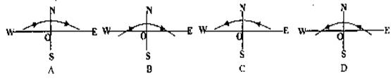 3.下面四幅图表示10月14日位于黑瞎子岛上中国国旗旗杆(旗杆立于O点)在平坦开阔地面上的杆影端点移动的轨迹和方向,其中正确的是 ( )