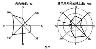 图二为某城市的风向玫瑰图和降水量与风向有关系图(某风向期间的降水量)。完