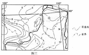读我国某地区年平均气温等温线分布图(图三),完成6-8题。