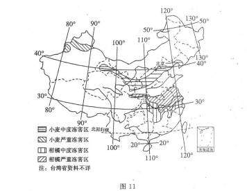 42.(10分)[选修 自然灾害与防治]读图11“中国小麦及柑橘冻害分布图”,完成下