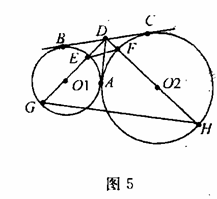 如图5,⊙O1和⊙O2 公切线AD和BC相交于点D,A、B、C为切点,直线DO1与⊙O1与E、G两点,直线DO2交⊙O2与F、H两点。
