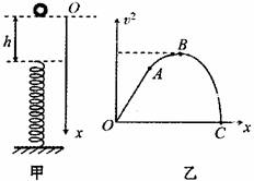 21.如图甲所示,劲度系数为k的轻弹簧竖直放置,下端固定在水平地面上。一质量为m的 小球,从距弹簧上端高h处由静止自由释放,在接触到弹簧后继续向下运动。若以小球开始下落的位置为原点,竖直向下建立坐标轴Ox,则小球的速度平方v2随坐标x的变化图象如图乙所示。其中OA为直线,并与平滑曲线ABC相切于A点;B点为曲线最高点。设小球的位置坐标为x,小球所受重力的瞬时功率为P,弹簧的弹性势能为EP。则下列判断正确的是( )