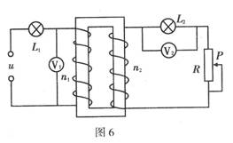 如图6所示的电路中,有一个理想变压器,原线圈匝数为n1,串联一只小灯泡L1,再并联一只电压表V1后接在稳定的交流电源上;副线圈匝数为n2,串联灯泡 L2和变阻器R,L2上并联电压表V2.现在向下移动滑动变阻器R的滑动触头P下列判断正确的是