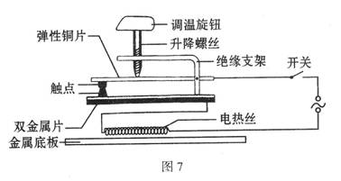8.利用双金属片温度传感器,可以控制电熨斗的温度,图7为电熨斗结构图,关于其控制温度的原理,下列说法正确的有 ( )