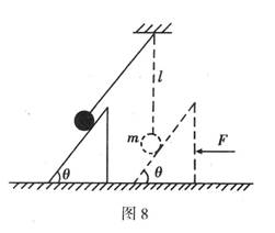 如图8所示,长为l的轻质细绳悬挂一个质量为m的小球,其下方有一个倾角为θ的光滑斜面体,放在光滑水平面上.开始时小球刚好与斜面接触,现在用水平力F缓慢向左推动斜面体,直至细绳与斜面平行为止,对该过程中有关量的描述,正确的有 ( )