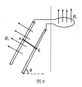 一个闭合回路由两部分组成,如图9所示,右侧是电阻为r的圆形导线;置于竖直方向均匀变化的磁场B1中,左侧是光滑的倾角为θ的平行导轨,宽度为d,其电阻不计.磁感应强度为B2的匀强磁场垂直导轨平面向上,且只分布在左侧,一个质量为m、电阻为R的导体棒此时恰好能静止在导轨上,分析下述判断不正确的有 ( )