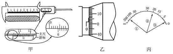 (1)(6分)有一游标卡尺,主尺的最小分度是1mm,游标上有20个小的等分刻度。用它测量一小球的直径,如图甲所示的读数是 mm。用螺旋测微器测量一根金属丝的直径,如图乙所示的读数是 mm。 用欧姆表测同一定值电阻的阻值时,分别用 ×1;×10;×100三个挡测量三次,指针所指位置分别如图丙中的①、②、③所示,被测电阻的阻值约为 Ω。