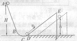 (2010潍坊一模)(1 5分)如图所示,固定轨道ABCD由斜面轨道AB和圆弧轨道BCD组成,AB与BCD相切于B点.质量M=3kg的三角形木块DEF静置于光滑水平地面上,木块的斜面DE与圆弧BCD相切于D点.质量m=l kg的小球从离地面高H=5.5 m的A点由静止释放,经过D点后以某一速度v0滑上木块的倾斜面DE,自D点经过时间t=1.4s,小球沿DE上升到最大高度h=4.2 m.若小球从A点运动到D点过程中阻力做功W=-5J,取g=10m/s2.求:
