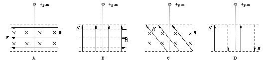 ⑻如下图所示,两虚线之间的空间内存在着正交或平行的匀强电场E和匀强磁场B,有一个带正电小球(电量为+q,质量为m)从正交或平行的电磁复合场上方的某一高度自由落下,那么,带电小球不可能沿直线通过下列哪个电磁复合场( )