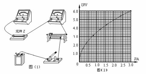 (4)若图(2)中的曲线是某同学按照第(1)问中的B电路而得到的曲线,且已知安培表的内阻为0.5Ω,试在图(2)中绘出元件Z准确的伏安特性曲线。