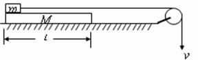 14、如图所示,质量为M、长为L的均质板放在很长的光滑水平桌面上,板的左端有一质量为m的物块,物块上连接一根很长的细绳,细绳跨过位于桌面的定滑轮,某人以恒定的速率v向下拉绳,物块最多只能到达板的中央,而此时的右端尚未到桌边定滑轮,试求: