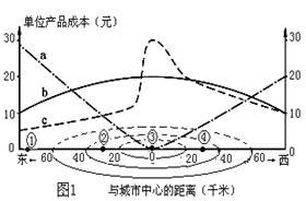 读某工业部门在某城市及其附近地区土地、运输和劳动力等成本曲线图。其中土地成本和运费都只与距城市中心的远近、交通通达度有关。完成3-5题。
