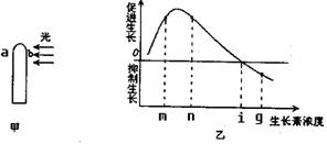 11.如下图所示,甲图表示胚芽鞘受到单侧光的照射,乙图表示不同浓度生长素溶液对胚芽鞘生长的影响,如果甲图中b处的生长素浓度为m,则a处生长素浓度x的范围是