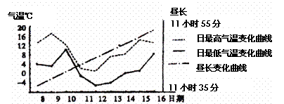 读我国某市某时段气温和昼长变化示意图,完成5-7题。