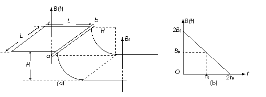 25、如图(a)所示,一端封闭的两条平行光滑导轨相距L,距左端L处的中间一段被弯成半径为H的1/4圆弧,导轨左右两段处于高度相差H的水平面上。圆弧导轨所在区域无磁场,右段区域存在磁场B0,左段区域存在均匀分布但随时间线性变化的磁场B(t),如图15(b)所示,两磁场方向均竖直向上。在圆弧顶端,放置一质量为m的金属棒ab,与导轨左段形成闭合回路,从金属棒下滑开始计时,经过时间t0滑到圆弧顶端。设金属棒在回路中的电阻为R,导轨电阻不计,重力加速度为g。