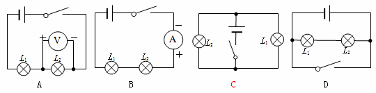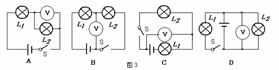 2(09兰州)在图3所示的电路中,闭合开关S,能用电压表测量L1两端电压的正确电路是D