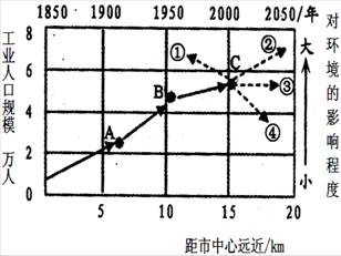 下图为某城市钢铁工业区位的变化。A、B、C为随着时间的推移该工业三次迁移的状况;①②③④是预测迁移方向。据此回答8-9题。