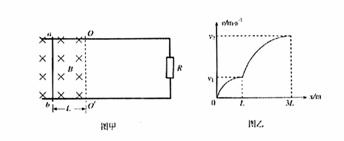 (2)若磁场的磁感应强度不变,金属杆ab在恒力作用下由静止开始向右运动3L距离,其v-x的关系图象如图乙所示。求:①金属杆ab在刚要离开磁场时的加速度大小;②此过程中电阻R上产生的焦耳热Q2。