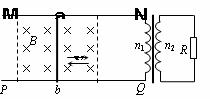 如图所示,MN、PQ是两条水平平行放置的光滑金属导轨,导轨的右端接理想变压器的原线圈,变压器的副线圈与电阻R=20Ω组成闭合回路,变压器的原副线圈匝数之比n1 : n2=1 : 10,导轨宽L=5m。质量m=2kg、电阻r=1Ω的导体棒ab垂直MN、PQ放在导轨上,在水平外力F作用下从t=0时刻开始在图示的两虚线范围内往复运动,其速度随时间变化的规律是v=2sin20πt m/s。垂直轨道平面的匀强磁场的磁感应强度B=4T。导轨、导线和线圈电阻不计。求:![]()