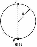 (辽宁省大连市2010年高三第一次模拟考试) 如图24所示,在一个竖直平面内放置半径R=10 cm的光滑圆环,环上套有两个可视为质点的小球A和B,A球的质量m1=1.0 kg,B球的质量m 2=3.0 kg。A球从圆环的最高点受轻微扰动后由静止开始沿圆环的左侧滑下,在最低点与静止的小球B发生弹性碰撞。求A、B两球在第一次碰撞后能上升的最大高度分别是多少?(g取10 m/s2)
