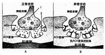 (3)在免疫学上,重症肌无力属于 病,患者所感染的病毒表面有一种 与ACh受体相似,此时ACh受体就成了 而被攻击。