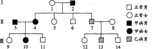 (3)假如Ⅲ一10和Ⅲ一13结婚,生育的孩子患甲病的概率是 ,患乙病的概率是 ,不患病的概率是 。