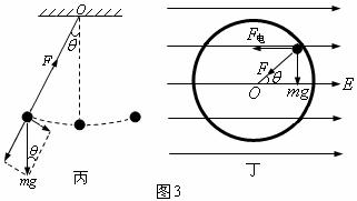 解析:如图3所示的丙和丁分别为甲、乙两图中小球的受力示意图,由圆周运动知识可知,丙图中是由绳的拉力和重力沿绳方向上分力的合力提供小球所需要的向心力;而丁图中则是由重力、电场力分别沿轨道半径方向上的分力和轨道的压力这三者的合力提供小球所需要的向心力。