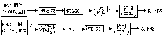 2、氨跟氧化铜反应可以制备氮气(2NH3+3CuO==== 3Cu+3H2O+N2),而氮气和镁在高温下反应得到氮化镁,但氮化镁遇水即反应得到Mg(OH)2和NH3。下面是甲、乙两同学提出的制备氮化镁的两种实验方案示意图(实验前系统内空气已排除;图中箭头表示气体的流向)。