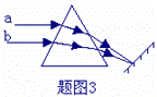3、如题图3所示,一束红光和一束蓝光平行入射到三棱镜上,经棱镜折射后,交会在屏上同上点,若n1和n2分别表示三棱镜对红光和蓝光的折射率,则有: