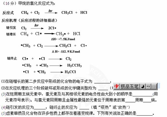 [猜题理由]本题以大学有机化学中烷烃氯化的自由基反应机理:链引发、链增长、链终止三个阶段为为载体,起点高,落点低,主要涉及选修模块3“物质结构”的“原子结构和元素的性质”“化学建与物质的性质”、必修2的“元素周期律”、模块4“化学原理”等内容,具体落实在电子式的书写、共价键类型、电负性大小比较、元素周期表、元素性质递变规律、物质的性质与共价键参数的关系、反应热、难溶物质的浓度积等知识点上。推理是本题的主要立意,要求考生根据已有的知识和题目给定的事实、数据和条件,提取、归纳相关信息,对化学问题进行逻辑推理和论证,得出正确的结论或作出正确的判断,并能把推理过程准确地表达出来。其中大部分知识点为安徽省2010年考试说明新增考点,必然在当年考试中有所体现,希引起广大考生重视。