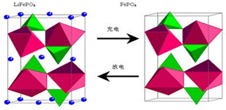 左边是橄榄石结构的LiFePO4作为电池的正极,由铝箔与电池正极连接,中间是聚合物的隔膜,它把正极与负极隔开,Li+可以自由通过而 电子e-不能通过,右边是由石墨和Li组成的电池负极,由铜箔与电池的负极连接。电池的上下端之间是电池的电解质,电解质通常是LiClO4、LiAlCl4、LiAsF4等锂盐,溶剂通常用环脂、直链脂及酰胺等有机溶剂和一些非水无机溶剂。电池由金属外壳密闭封装。