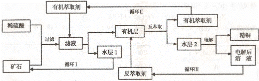 45.现代社会中铜在电气、交通、机械和冶金、能源及石化工业、高科技等领域有广泛的应用。某铜矿石含氧化铜、氧化亚铜、三氧化二铁和脉石(Si02) ,现采用酸浸法从矿石中提取铜,其工艺流程图如下。其中铜的萃取(铜从水层进人有机层的过程)和反萃取(铜从有机层进人水层的过程)是现代湿法炼铜的重要工艺手段。