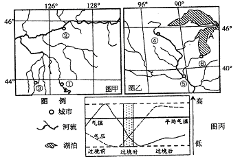 (1)隆冬时节,图甲、图乙两区域可受到图丙所示天气系统影响,简述在该天气系统影响下的天气变化过程。(11分)
